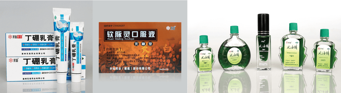 公司主導(dǎo)產(chǎn)品為水仙牌系列產(chǎn)品:風(fēng)油精、無極膏、丁硼乳膏、軟脈靈、滿山白、眠安寧等。